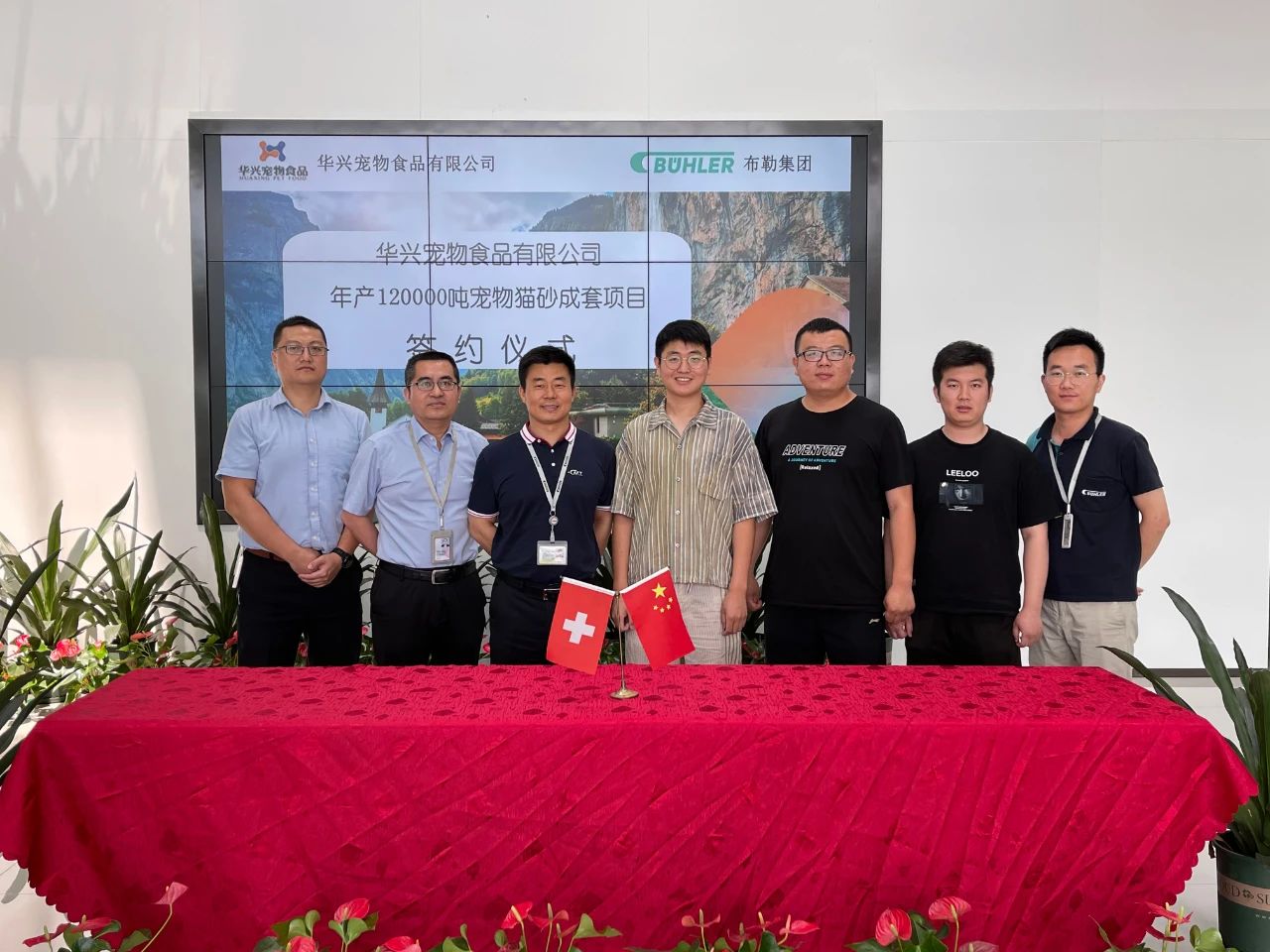 2021年6月9日,華興寵物食品有限公司年產(chǎn)12萬噸寵物貓砂成套項(xiàng)目與布勒集團(tuán)正式簽約。這也是我公司繼寵物主糧后在寵物貓砂項(xiàng)目上再次引進(jìn)布勒生產(chǎn)設(shè)備。